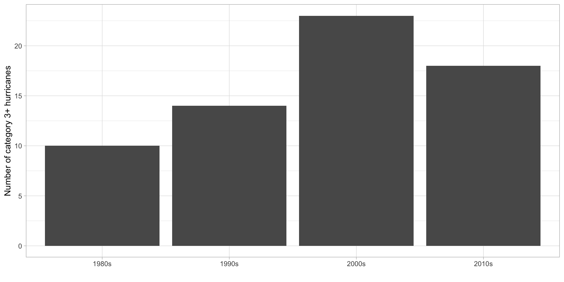 labs(x = "", y = "Number of category 3+ hurricanes") +