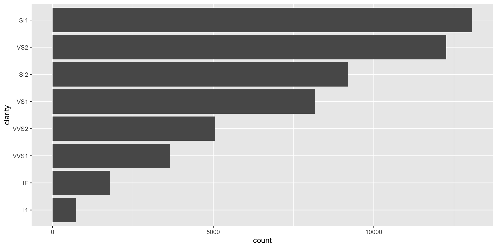 Use the fct_infreq() function to sort factor levels according to frequency, then plot in a horizontal bar chart: