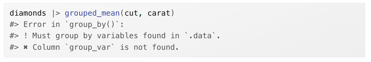cut (or any other grouping variable)carat (or any other numeric variable)Tidy evaluation allows us to refer to variable names directly when using tidyverse functions. However, special treatment is required when you use functions that use tidy evaluation.