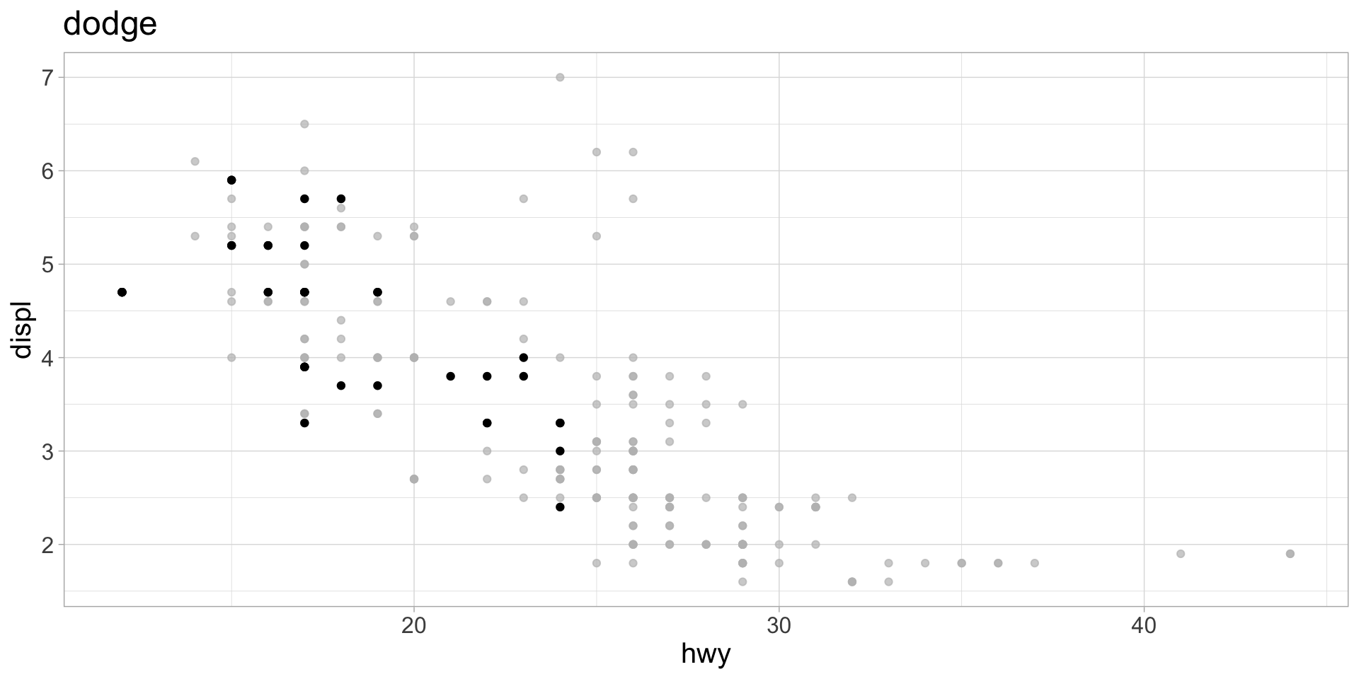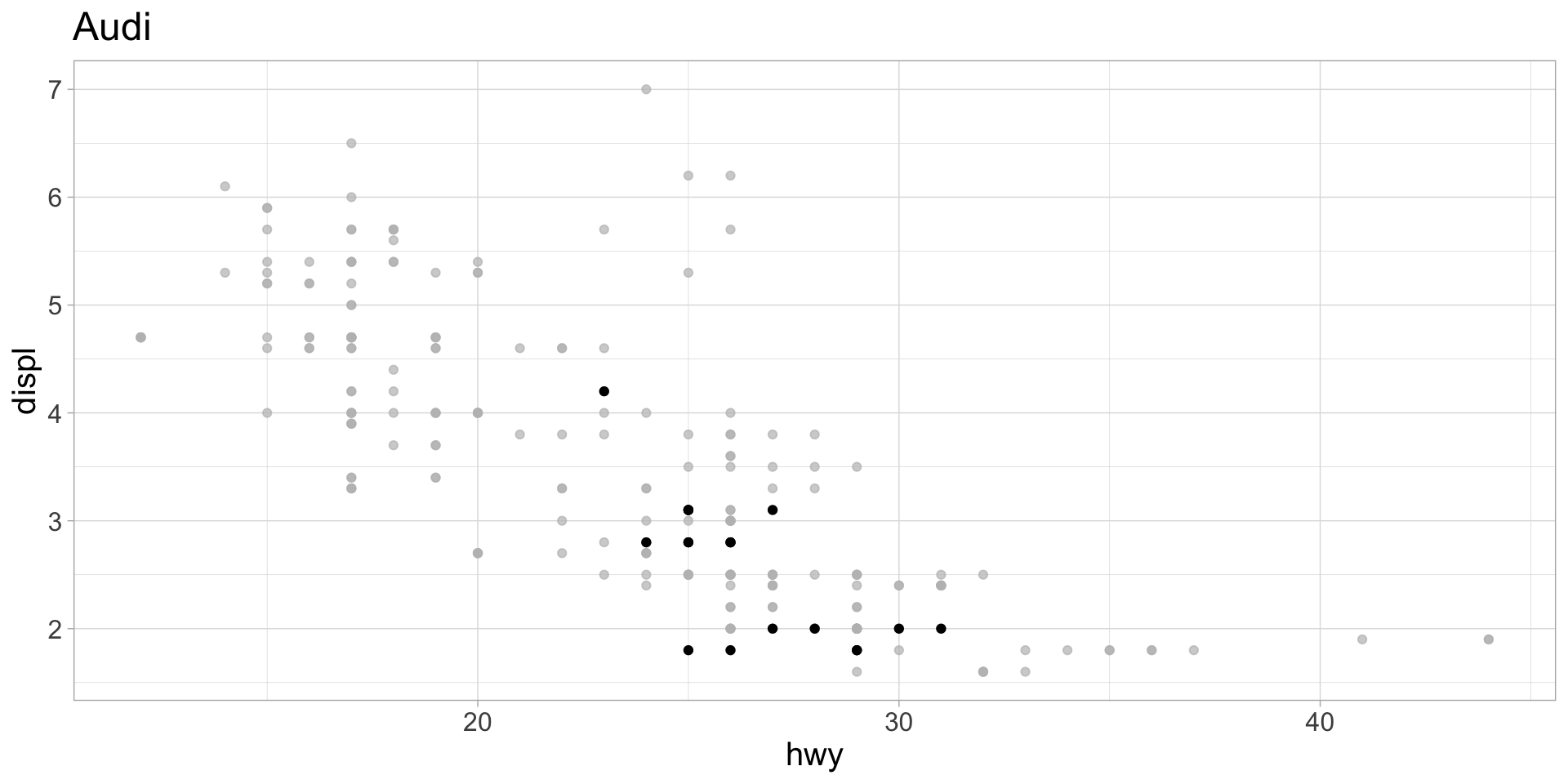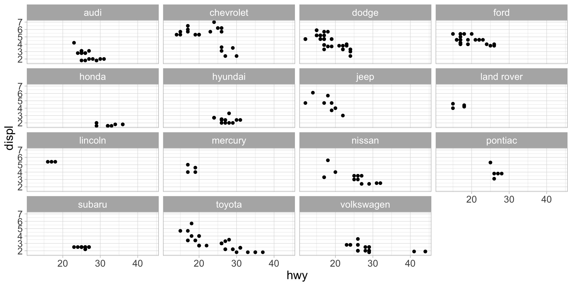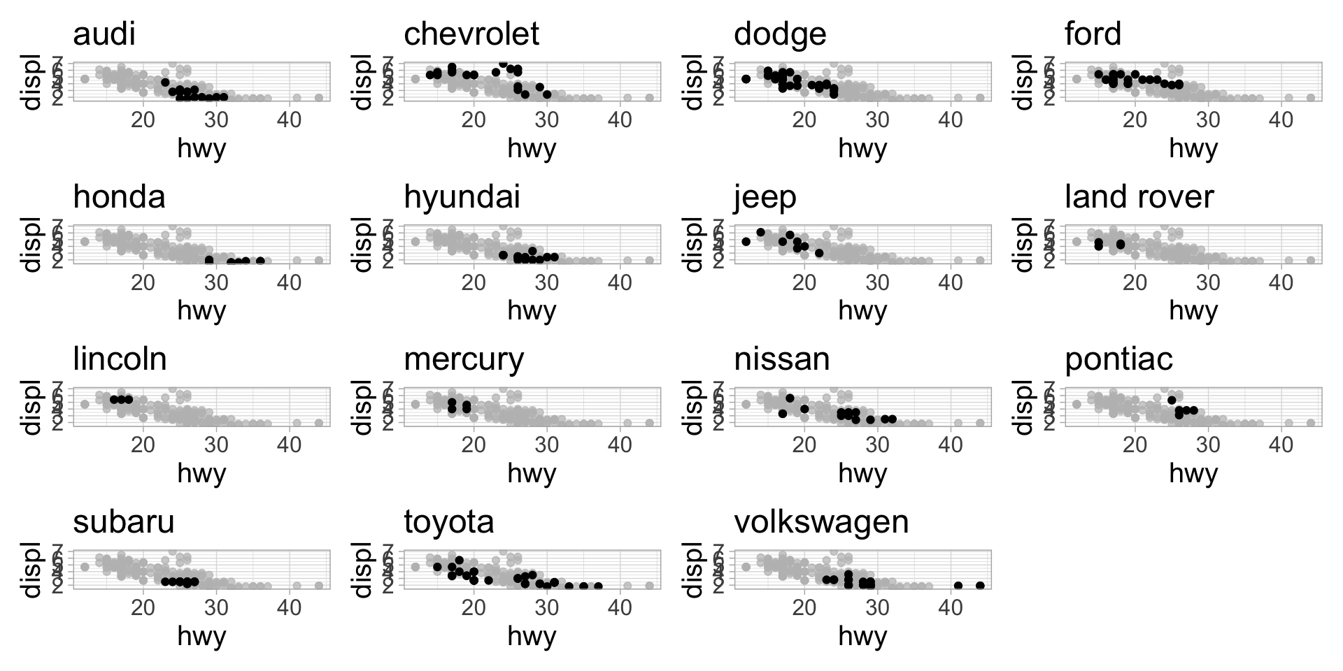 mpg dataset, plot highway mpg vs displacement, with points highlighted for each manufacturergghighlight functionmfr)mfr argument and not literally mfrmakes) to iterate overdistinct() finds unique values of the manufacturer column in the mpg dataset. We need to use the unlist() function to make mfrs a one-dimensional vector.