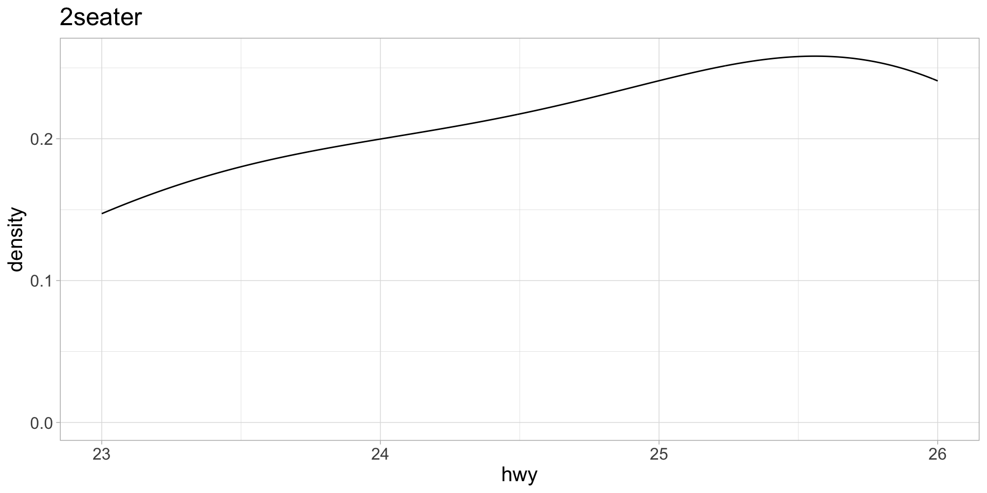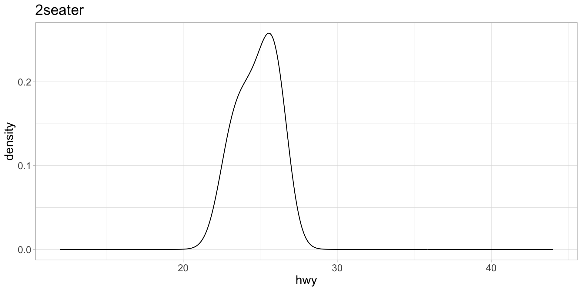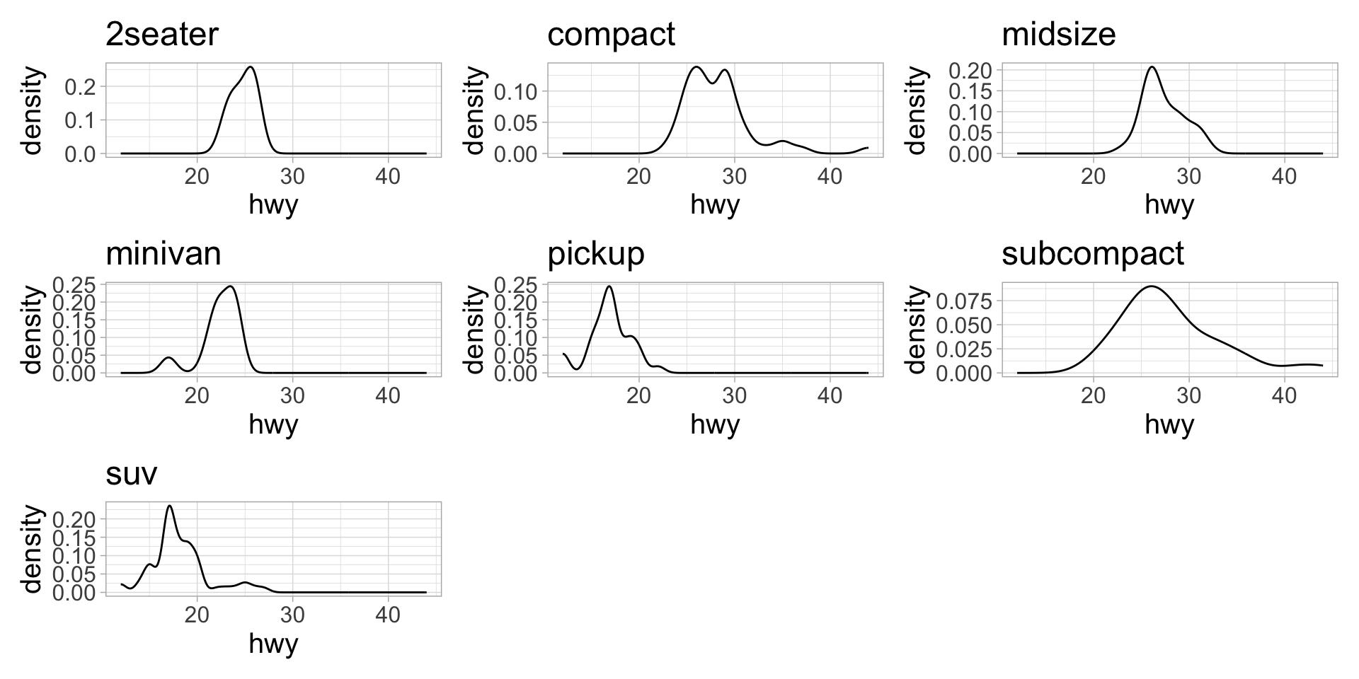 map() to execute the function iteratively over each manufacturer. Assign the output to a list called plot_list.group_split() and apply a function to each element of the list.Here, let’s create a density plot of highway mileage for each class of cars in the mpg dataset