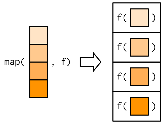 map() executes a function (.f) for each element of your input data (.x).x), map() functions work well with piping (|>)map(.x, .f, ...)map() columns of a data frameUsage: map(.x, .f, ...)