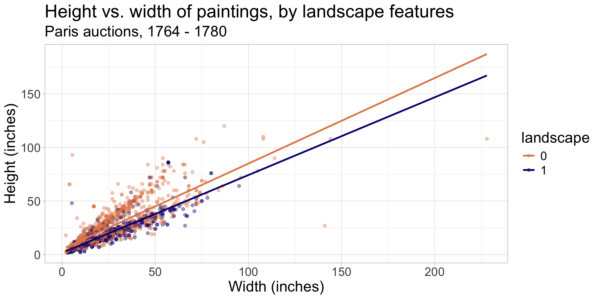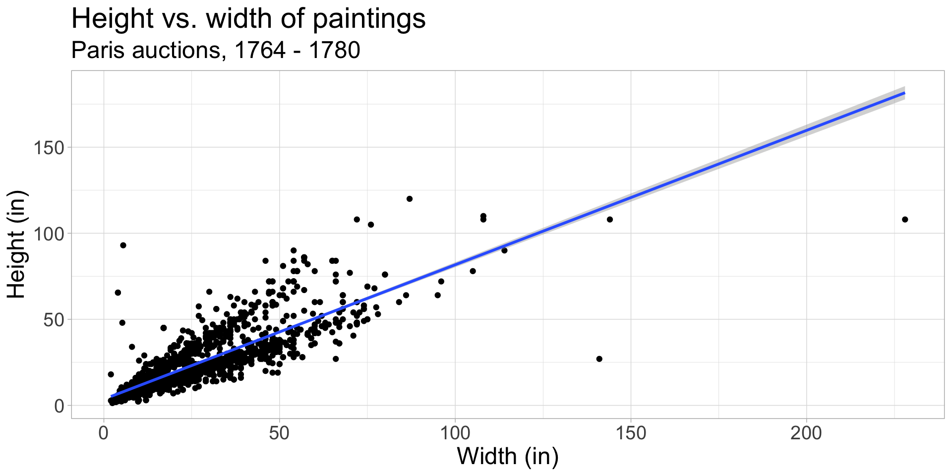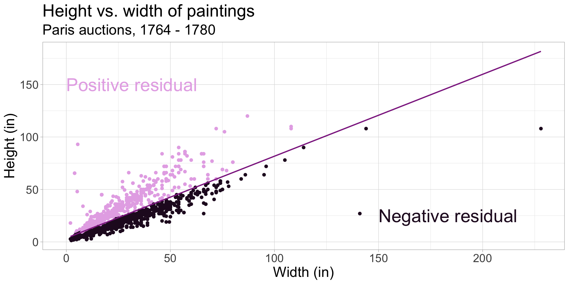 annotate("text", x = 150, y = 25, label = "Negative residual", color = "#260b27", hjust = 0, size = 8)The plot below displays the relationship between height and width of paintings. The only difference from the previous plots is that it uses a smaller alpha value. What feature is apparent now that was not (as) obvious in the previous plots? What might be the reason for this feature?
