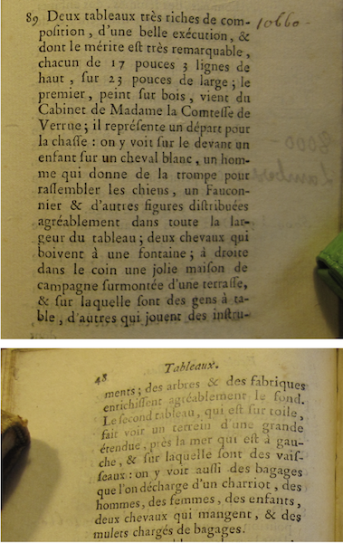 “Two paintings very rich in composition, of a beautiful execution, and whose merit is very remarkable, each 17 inches 3 lines high, 23 inches wide; the first, painted on wood, comes from the Cabinet of Madame la Comtesse de Verrue; it represents a departure for the hunt: it shows in the front a child on a white horse, a man who gives the horn to gather the dogs, a falconer and other figures nicely distributed across the width of the painting; two horses drinking from a fountain; on the right in the corner a lovely country house topped by a terrace, on which people are at the table, others who play instruments; trees and fabriques pleasantly enrich the background.”